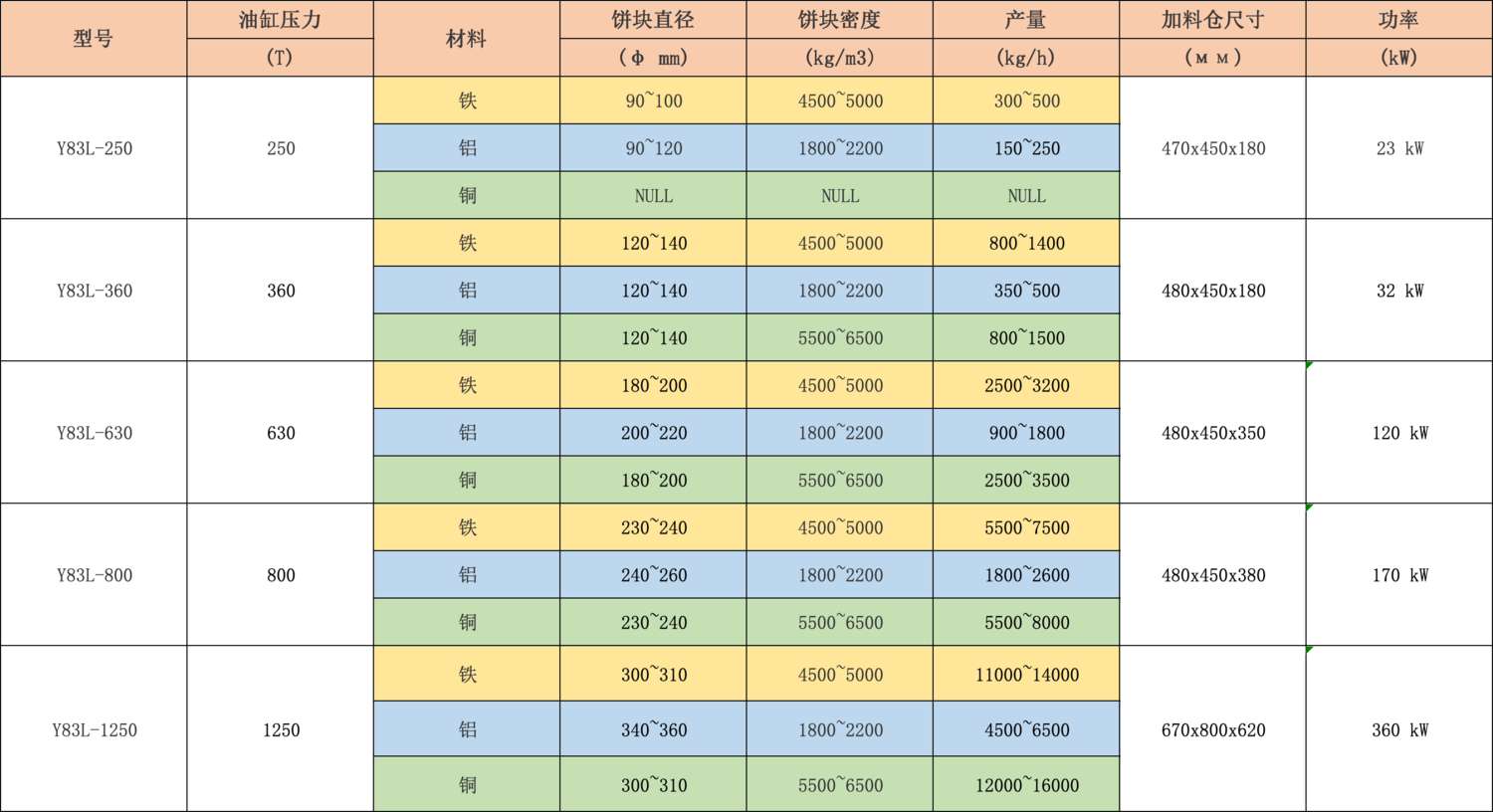 Y83系列金屬屑壓塊機(屑餅機),適用于鋁合金型材廠、鑄鋼廠、鑄鋁廠、鑄銅廠,將各種金屬屑(鐵屑、銅屑、不銹鋼屑、鋁屑等)、粉粒狀金屬粉(鐵粉、鋁粉、銅粉、鉛粉等)壓塊回爐,替代廢鋼、生鐵、鋁錠、廢銅作原材料,可減少燒損。該設備能將粉粒狀的鑄鐵屑、鋼屑、銅屑、鋁屑等直接冷壓成3~6公斤的圓柱餅塊,以便于運輸、投爐、整個過程不需加溫、添加劑,或其他工藝。鑄鐵屑壓制后密度可達5~6T/m3。該產品還可根據客戶要求,采用國產或進口液壓、電氣元件,配自動加料、稱重等裝置。